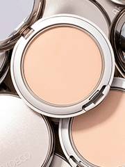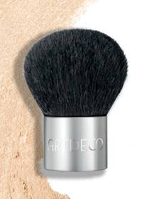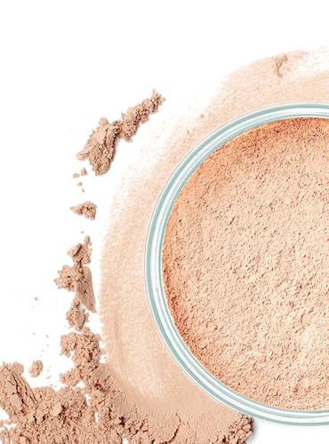 Put a little powder in the foundation lid. Pick up the powder with a powder brush. Hold the brush vertically (hair facing upwards) and remove any excess powder by tapping the handle against the back of your hand to ensure it is evenly distributed in the brush.