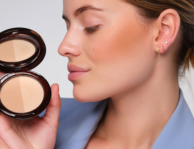 Appliquez la poudre bronzante à l’aide d’un pinceau à poudre biseauté sur le sommet de vos pommettes et sur les tempes, avant de l’estomper. Retrouvez ici toutes les informations concernant notre poudre bronzante.
