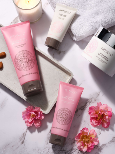 La nostra linea di trattamenti per il corpo "Spirit of Sakura" combina l'estratto di fiori di ciliegio dall'effetto antiossidante, che migliora la naturale funzione di barriera della pelle, con il prezioso olio di mandorle. Non solo nutre e idrata intensamente la pelle, ma contrasta anche le impurità e gli arrossamenti.